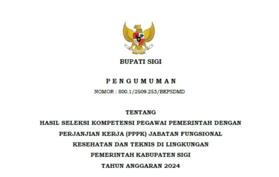 PENGUMUMAN HASIL SELEKSI KOMPETENSI PPPK JABATAN FUNGSIONAL KESEHATAN DAN TEKNIS PEMERINTAH KABUPATEN SIGI TAHUN 2024 Pengumuman Admin 01 January 2025 - 14:00:21pm 2321 views
