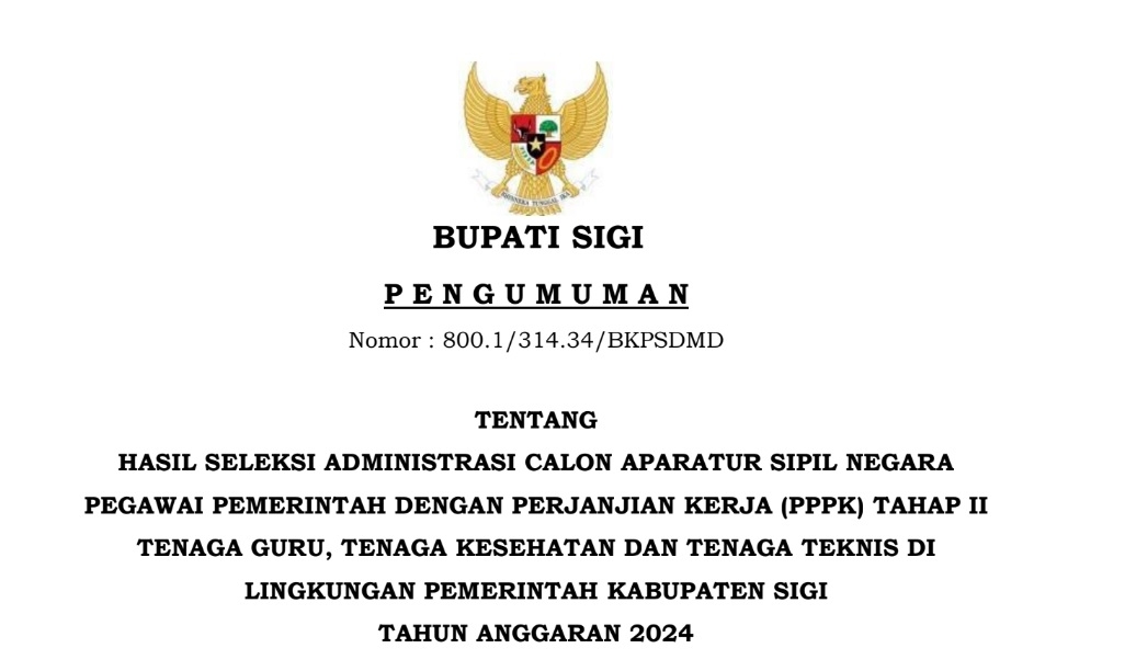 HASIL SELEKSI ADMINISTRASI CALON APARATUR SIPIL NEGARA PEGAWAI PEMERINTAH DENGAN PERJANJIAN KERJA (PPPK) TAHAP II TENAGA GURU, TENAGA KESEHATAN DAN TENAGA TEKNIS DI LINGKUNGAN PEMERINTAH KABUPATEN SIGI TAHUN ANGGARAN 2024 Pengumuman Admin 19 February 2025 - 04:52:21am 1328 views