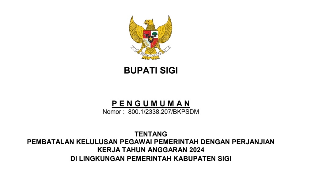 PENGUMUMAN PEMBATALAN KELULUSAN PEGAWAI PEMERINTAH DENGAN PERJANJIAN KERJA TAHUN ANGGARAN 2024 DI LINGKUNGAN PEMERINTAH KABUPATEN SIGI Pengumuman Admin 01 January 2026 - 00:00:24am 57 views