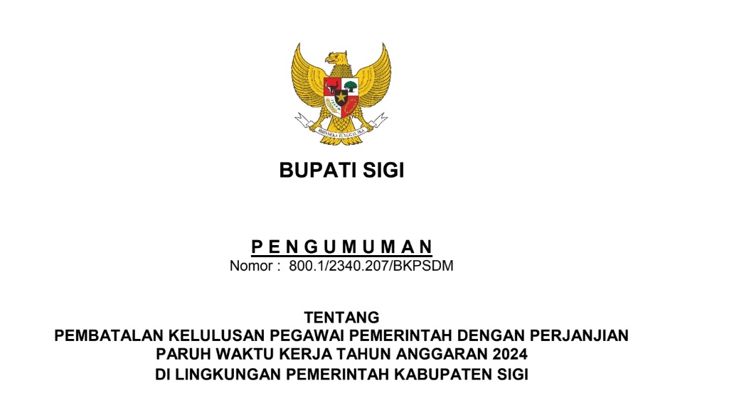 PENGUMUMAN PEMBATALAN KELULUSAN PEGAWAI PEMERINTAH DENGAN PERJANJIAN PARUH WAKTU KERJA TAHUN ANGGARAN 2024 DI LINGKUNGAN PEMERINTAH KABUPATEN SIGI Pengumuman Admin 01 January 2026 - 00:03:23am 75 views